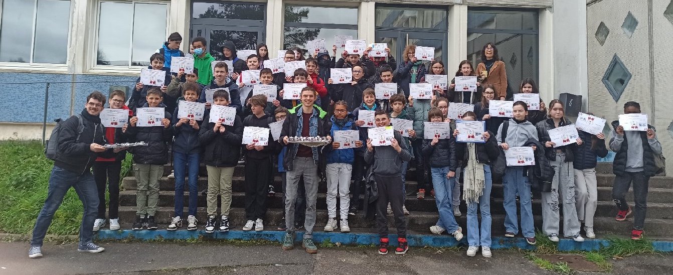 Les élèves de 5e C recevant le chèque des mains de Maël de Calan |