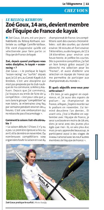 Sélection d’une élève dans l’équipe de France de kayak