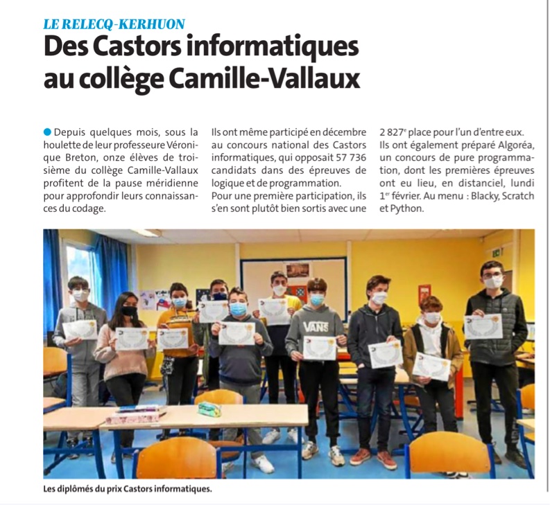 Les lauréats du concours Castors de l’informatique dans Le Télégramme