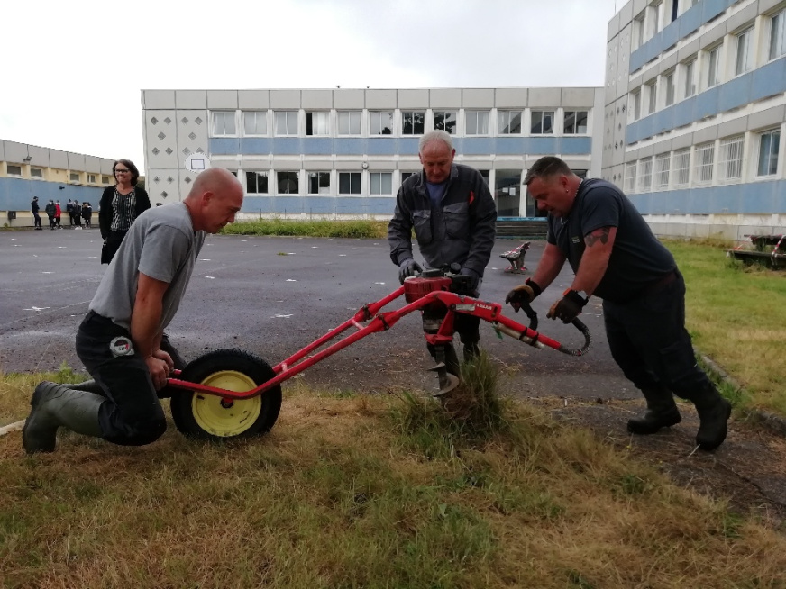 Lundi 15 et mardi 16 juin, 6 agents de maintenance de collèges finistériens (Guipavas, Plabennec, Sizun, Penn Ar C’hleuz, La Fontaine Margot et les Iles du ponant) sont venus prêter main forte à M. Jégou, l’un de nos agents de maintenance pour mettre en place l’enclos destiné à l’éco-pâturage.
