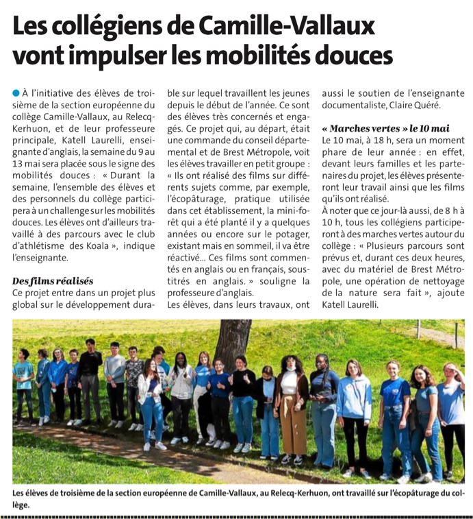 À l’initiative de la section européenne, une semaine de mobilités douces se tiendra la semaine du 9 au 13 mai prochain. L’ensemble des élèves et du personnel est invité à venir au collège à l’aide de moyens éco-responsables (à vélo, en co-voiturage, à pied, etc…).